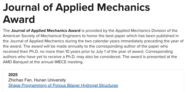 近日,机械院范智超副教授荣获由美国机械工程师学会(The American Society of Mechanical Engineers,ASME)颁发的应用力学杂志奖(Journal of Applied Mechanics Award),以表彰其发表在国际力学领域知名期刊ASME《Journal of Applied Mechanics》的论文《Shape Programming of Porous Bilayer Hydrogel Structures》在固体力学领域的杰出贡献。